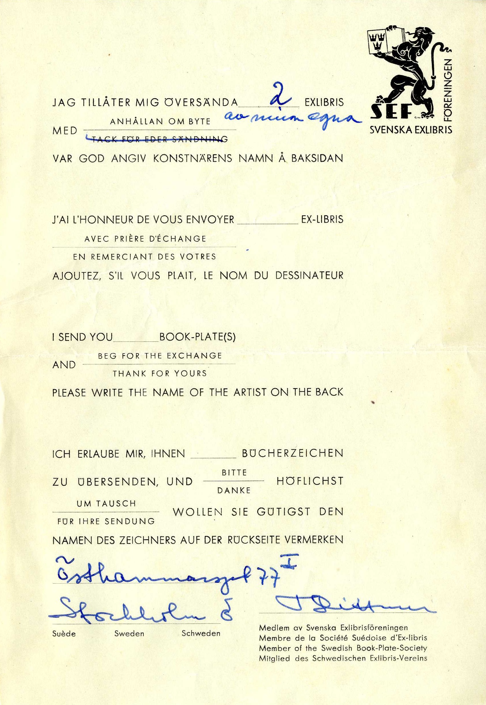 Bytesblankett Svenska Exlibrisföreningen. Ur Diakonissa Ester Albins exlibrissamling. Klicka på bilden för större bild.